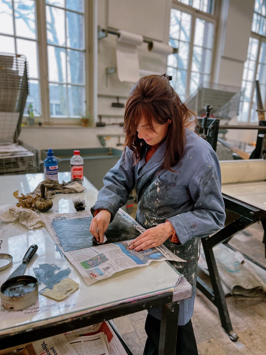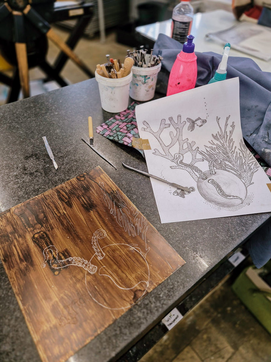 Doordat ze lesgeeft, hakt ze haar werkweek wel doormidden, want een week niet naar school gaan is toch wat lastig. Zo lang kunnen haar leerlingen haar niet missen! Ze gaat aan de slag met het maken van een ets met als thema een bijzondere onderwaterwereld én een risoprint met een vrolijke kip. Twee uiterste onderwerpen én technieken: dat is wat ook zo leuk is aan een werkweek bij het GA. Het kan allemaal!