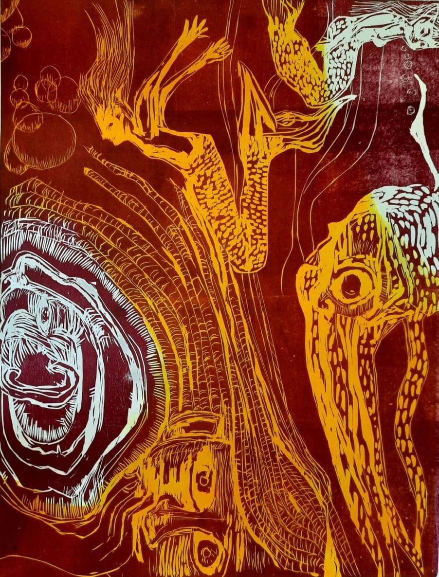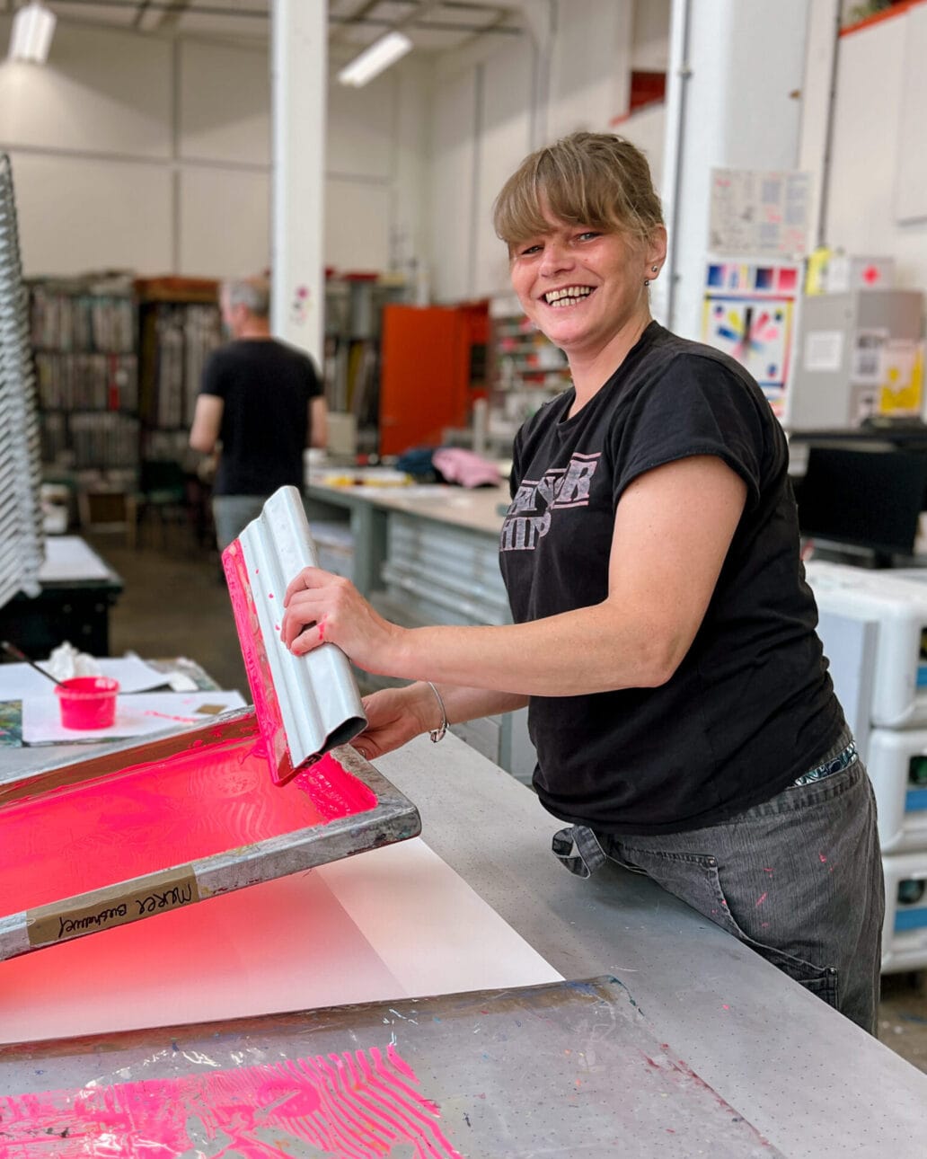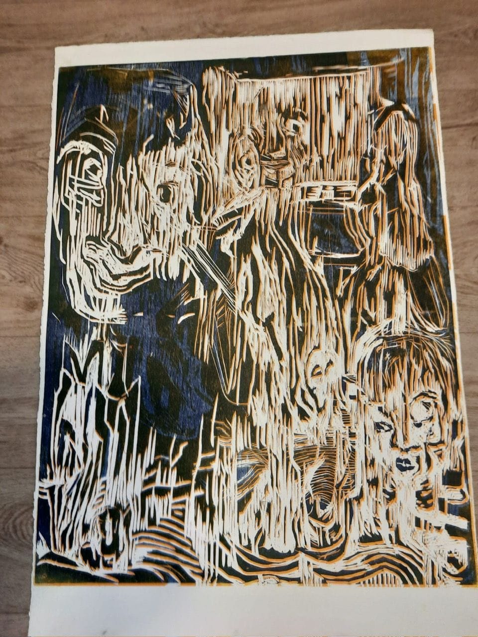 In het begin was het nog even zoeken naar alle spullen, maar nu voelt Merel zich als een vis in het water in onze werkplaats. Dat kan natuurlijk ook niet anders met zoveel ervaring! Ze is gespecialiseerd in zeefdruk, maar heeft de laatste jaren op de academie ook veel met houtsnedes gewerkt. Op dit moment werkt ze veel met linosnedes, maar zeefdrukken blijft toch haar grote liefde. Ze kijkt er naar uit om meer technieken te ontdekken en geïnspireerd te worden door de werkplaats en haar bezoekers.